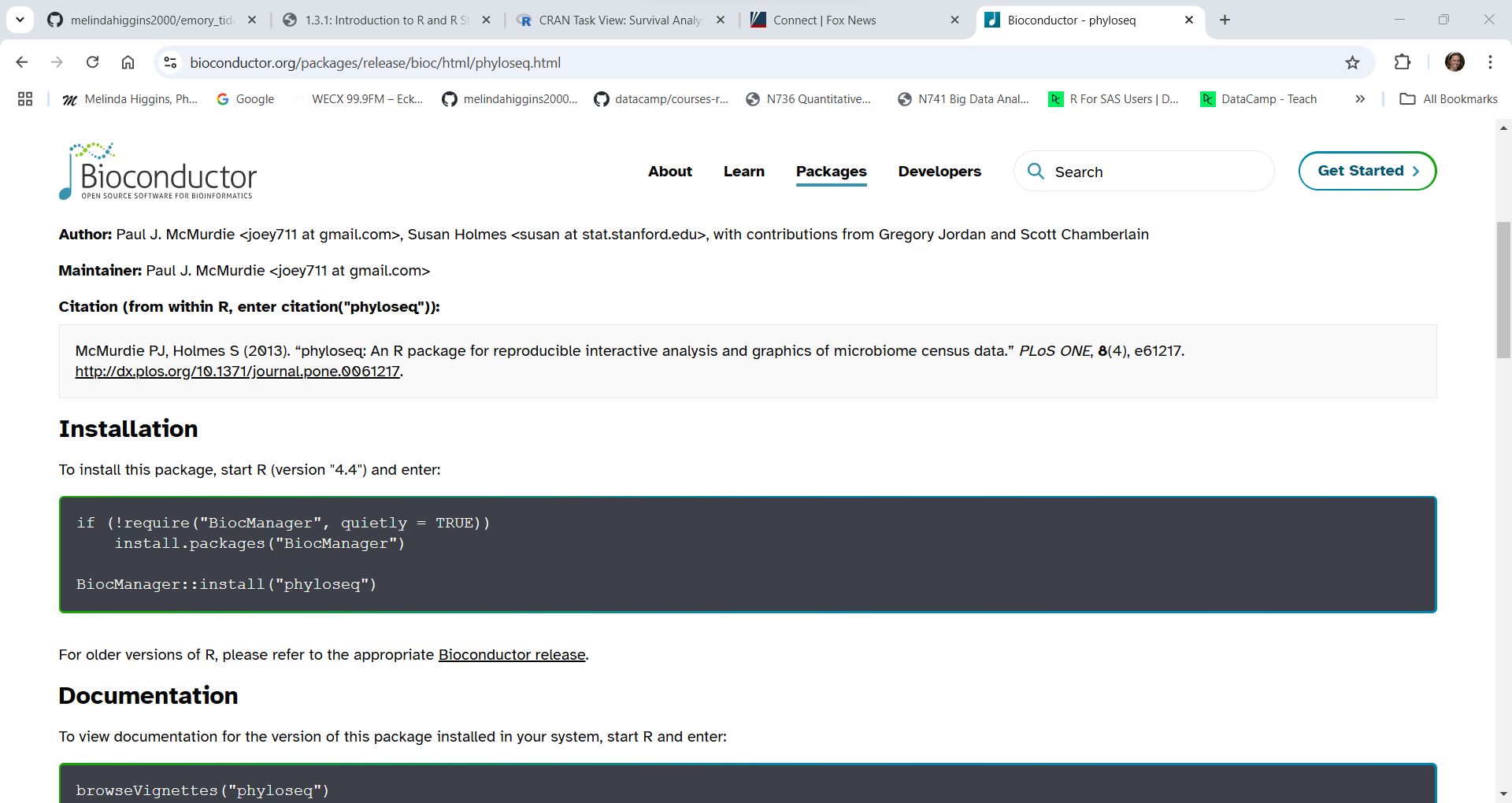 For example, here is what you need to do to install the phyloseq package which “… provides a set of classes and tools to facilitate the import, storage, analysis, and graphical display of microbiome census data”.