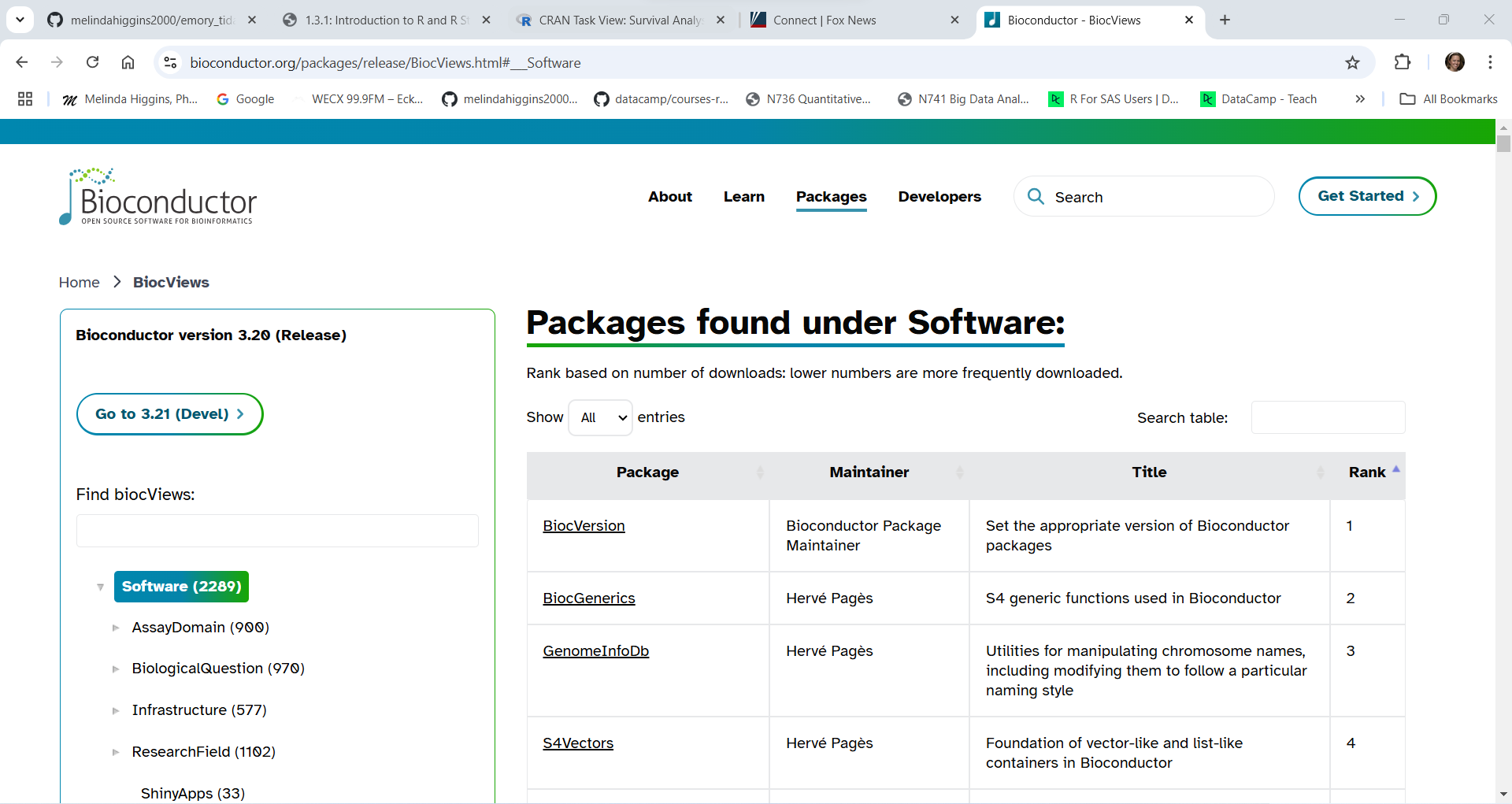 As of right now (01/10/2025 at 6:45pm EST) there are 2289 packages on Bioconductor. Similar to CRAN, Bioconductor requires each package to meet certain validation criteria and code testing requirements but these criteria are even more stringent on Bioconductor than on CRAN. You’ll notice that you can search for packages under the biocViews (left side column) or you can sort them alphabetically or search for individual packages in the section on the right side.