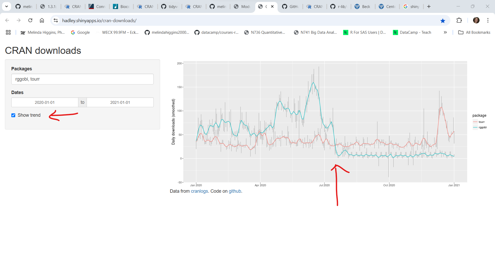 Here is an example of two specific packages I like. The rggobi package which was great for visualizing multiple dimensions of data simultaneously but which is no longer supported. But there is now a newer tourr package which was written by the same developers to replace the rggobi package. You can see that in the middle of 2020, the number of downloads for rggobi dropped almost to 0 and the tourr package downloads started to rise - this is about when rggobi was archived on CRAN and they switched over to maintaining the newer tourr package.