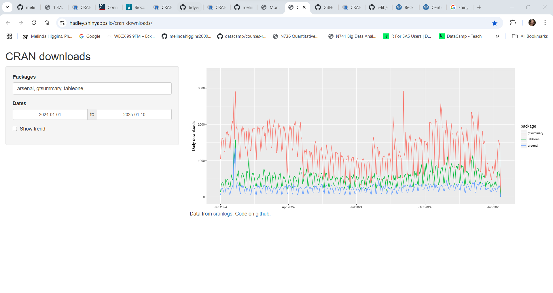 Here is an example comparing the arsenal, gtsummary, and tableone packages all of which are useful for making tables of summary statistics (aka, “Table 1”) - showing the number of downloads since the beginning of Jan 1, 2024.