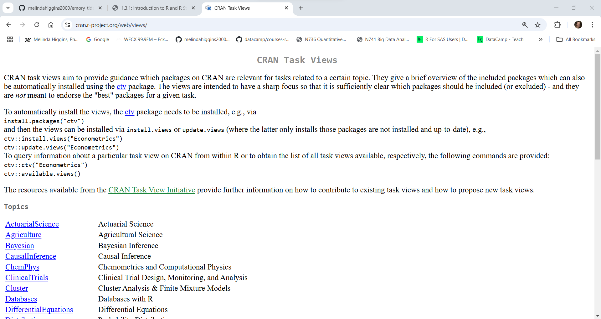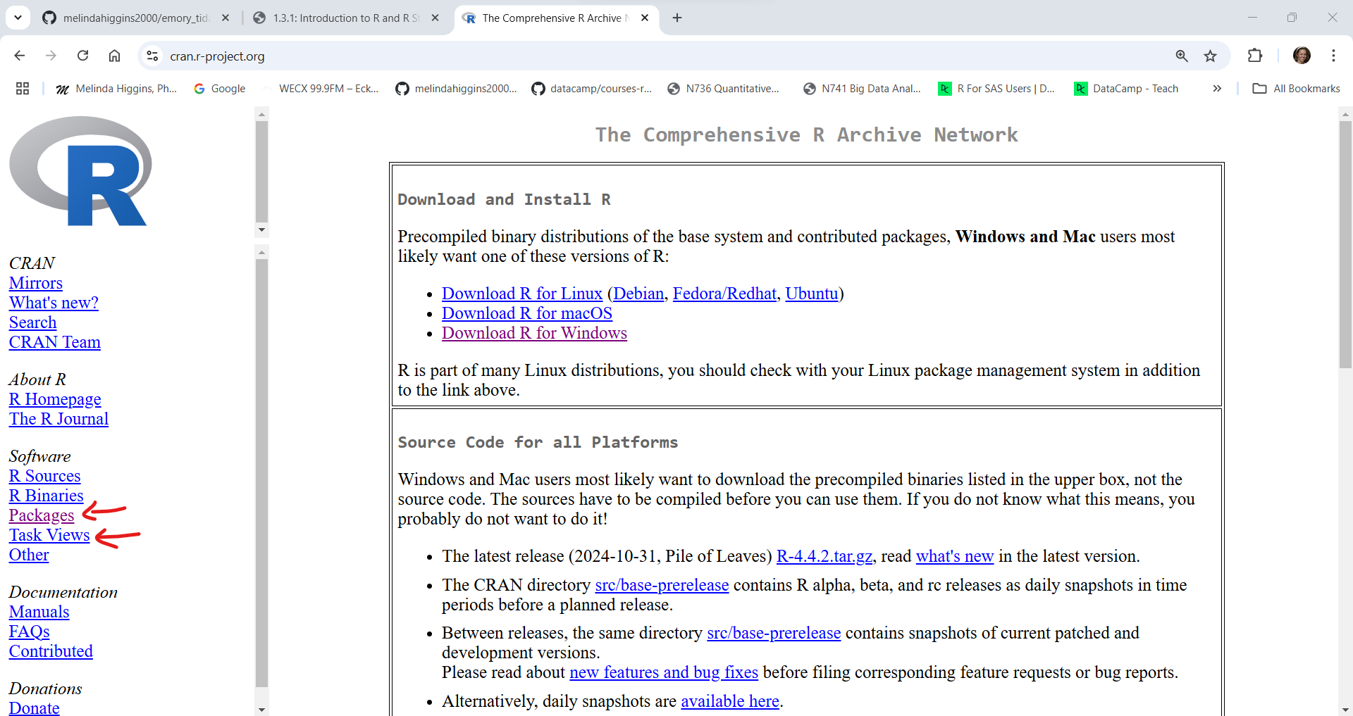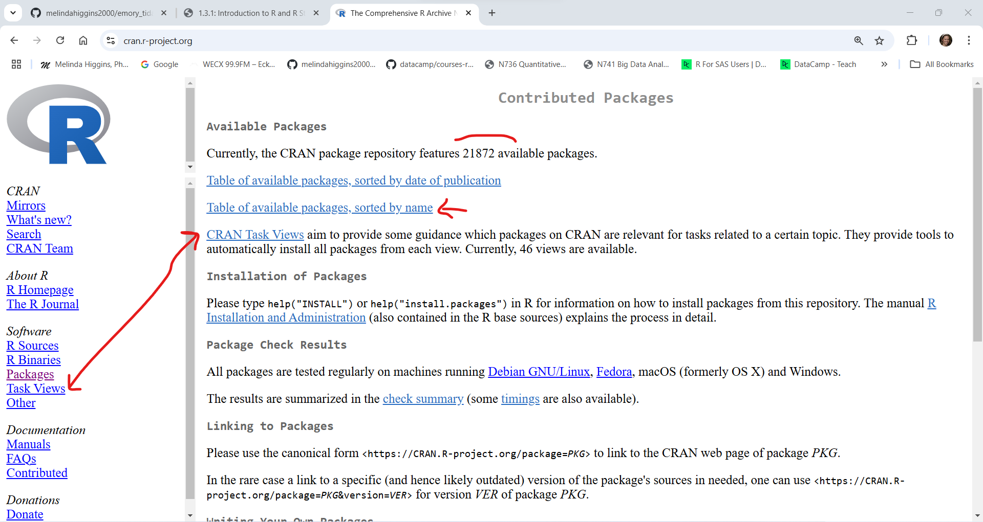 Next click on “Packages” at the left to see the full list of packages currently available. As of right now (01/10/2025 at 5:12pm EST) there are 21,872 packages. This number increases every day as people create, validate and publish their packages on CRAN. You can get a list of all of the packages or if you have no idea what package you need, you can also look at the “Task Views” to see groupings of packages.
