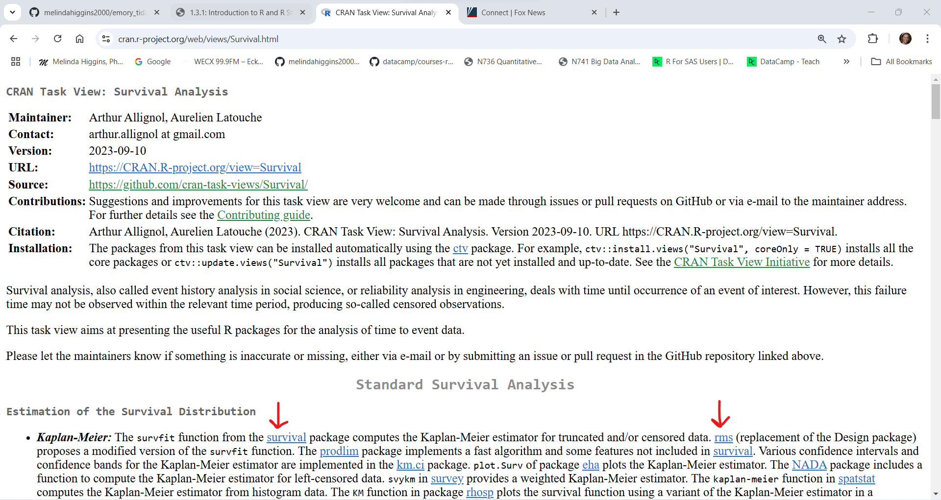 As you can see each Task View has a person(s) listed who help to maintain these collections. As you scroll through the webpage, you’ll see links to packages they recommend along with a description of what the packages do. For example, see the links below to the survival and rms packages.