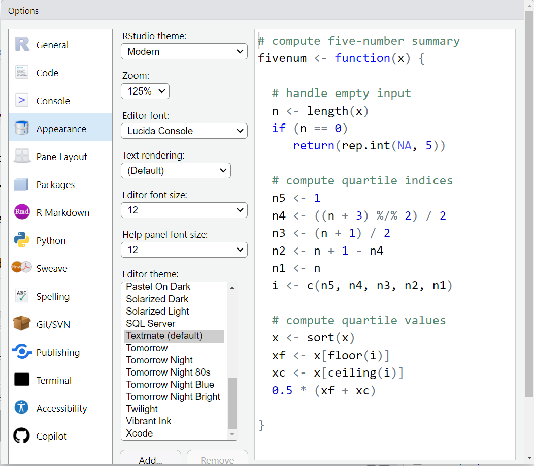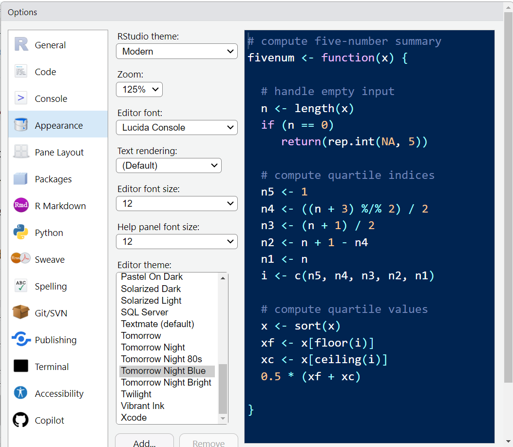 I also encourage you to try out different “Editor Themes” which will change the colors of the R code as well as background colors (light or dark).