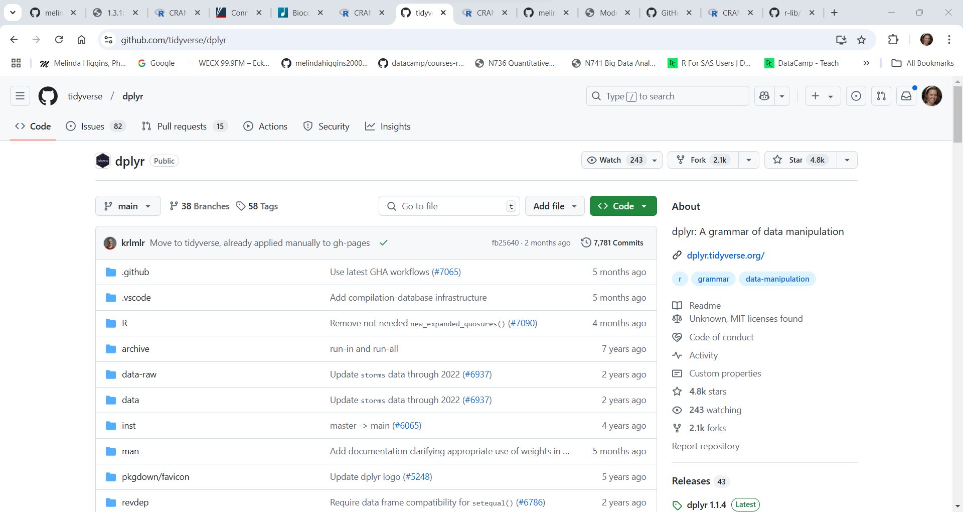 For example, the current published version of the data wrangling R package dplyr on CRAN was last updated on 11/17/2023 (over a year ago).