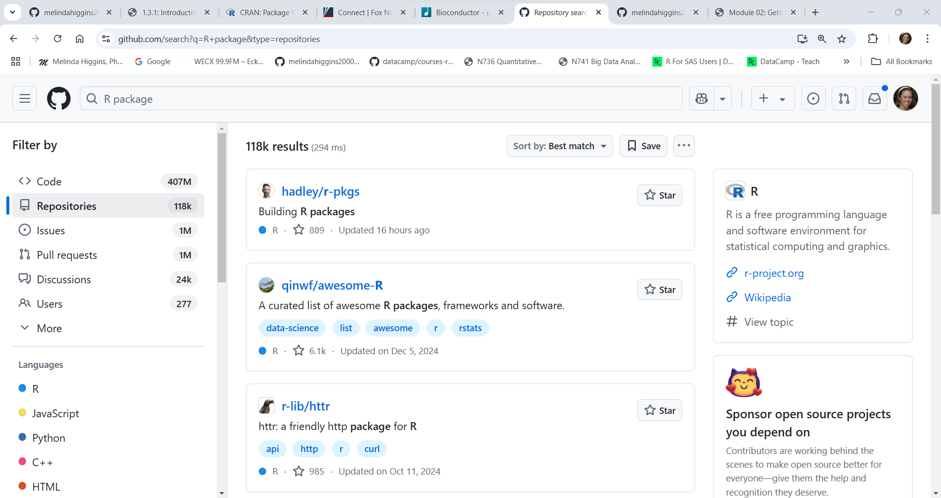To get an idea of how many packages may be currently on Github, we can “search” for “R package” at https://github.com/search?q=R+package&type=repositories and as you can see this is well over 118,000+ packages.
