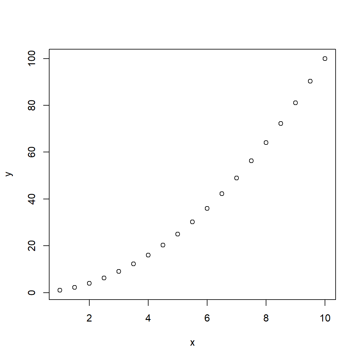 y <- x*xOnce the object y is created, we can make a simple 2-dimensional scatterplot using the built-in plot() base R function.