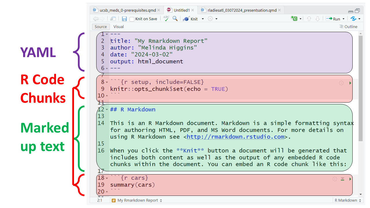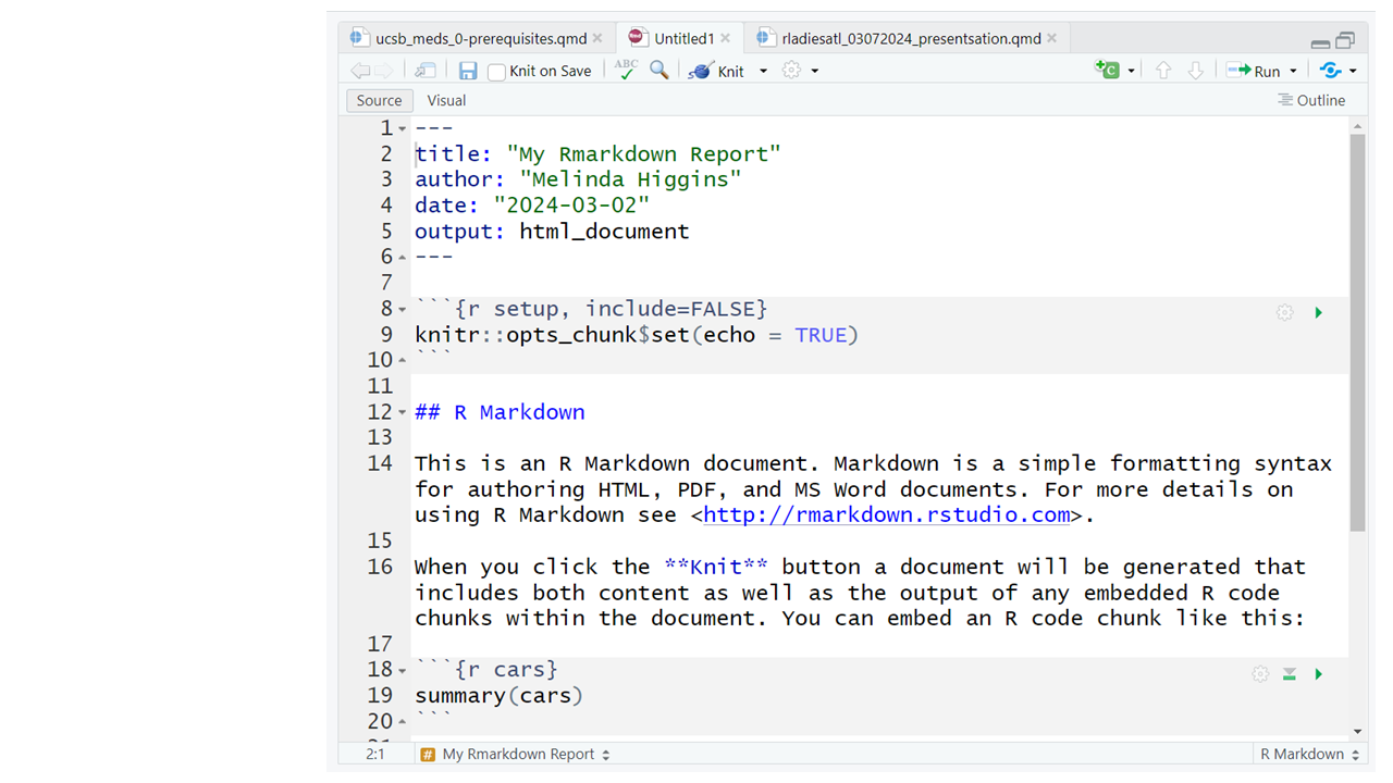 We will do more in the later lesson 1.3.6: Putting reproducible research principles into practice, but let’s take a look at an Rmarkdown file and how we can use it to create a report that combines together data + code + documentation to produce a seamless report.