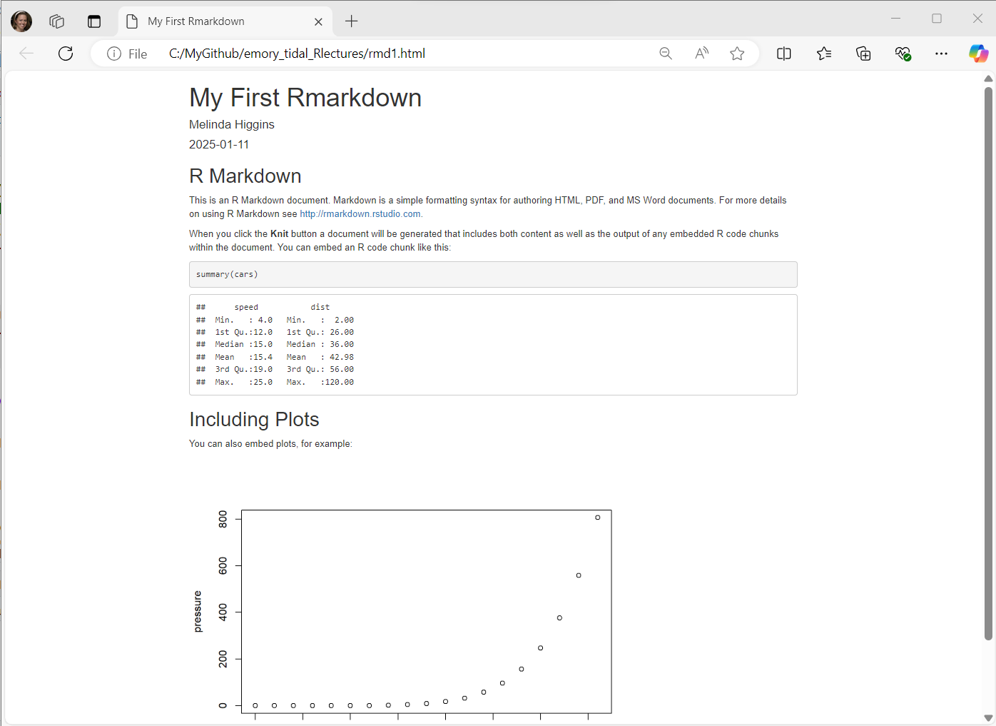 At the top of the page you’ll notice a little blue button that says “knit” - this will “knit” (or combine) the output from the R code chunks and format the text as “marked up” and produce this HTML file (which will open in a browser window):