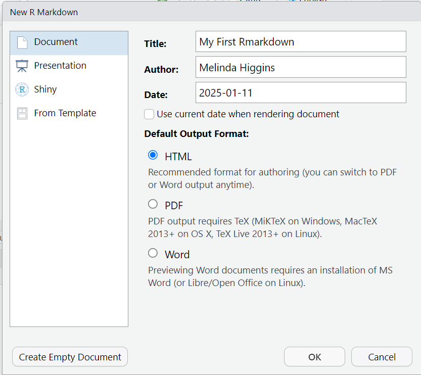 Type in a title, your name, the date and choose the format you’d like to create. For your first document I encourage you to try HTML. But you can create WORD (DOC) documents and even PDFs. In addition to documents, you can also create slide deck presentations, Shiny apps and other custom products like R packages, websites, books, dashboards and many more.