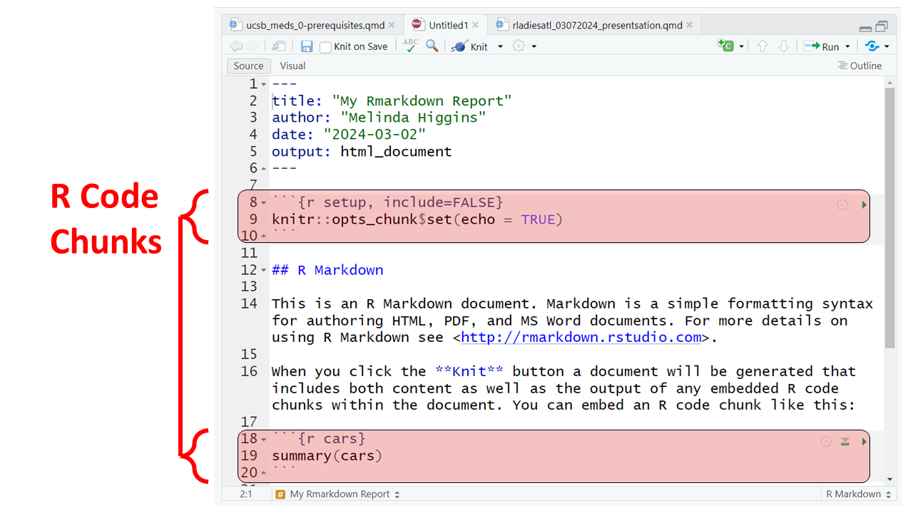 Notice that the code block starts and ends with 3 backticks ``` and includes the {r} Rlanguage designation inside the curly braces.
