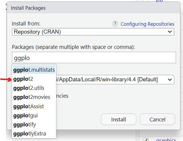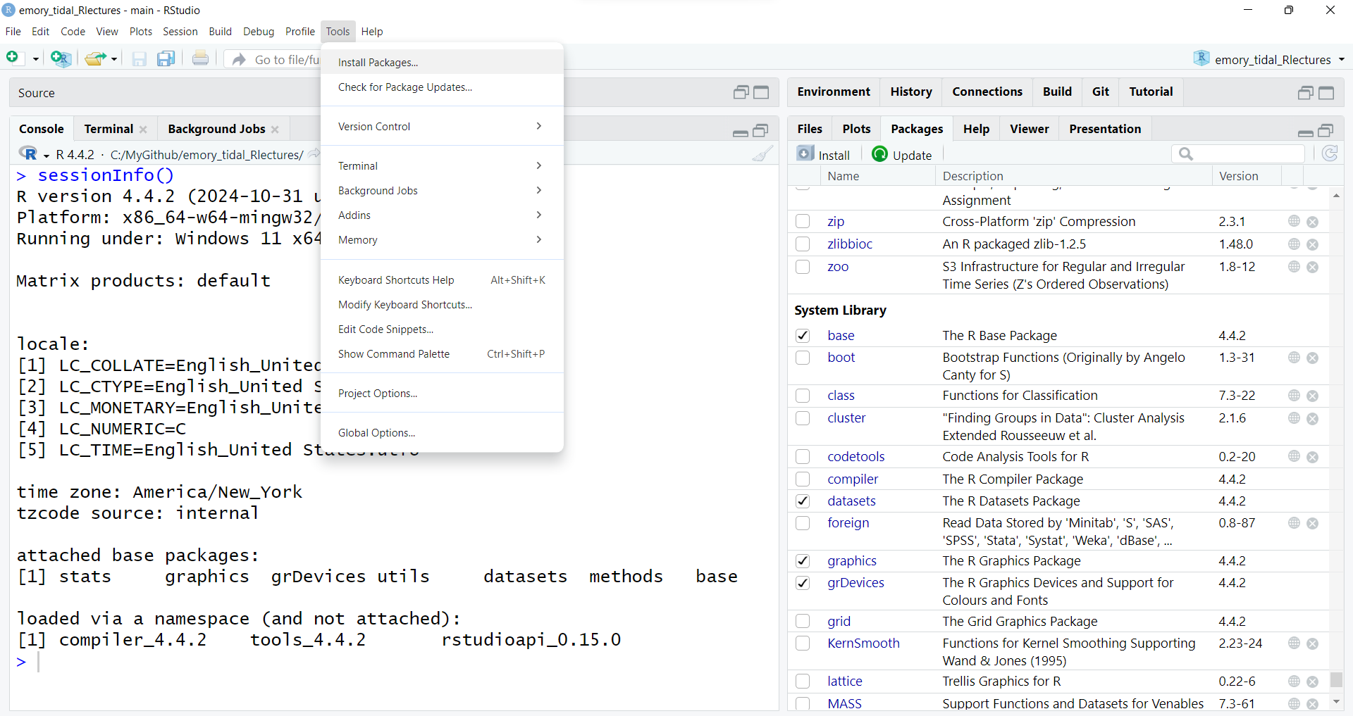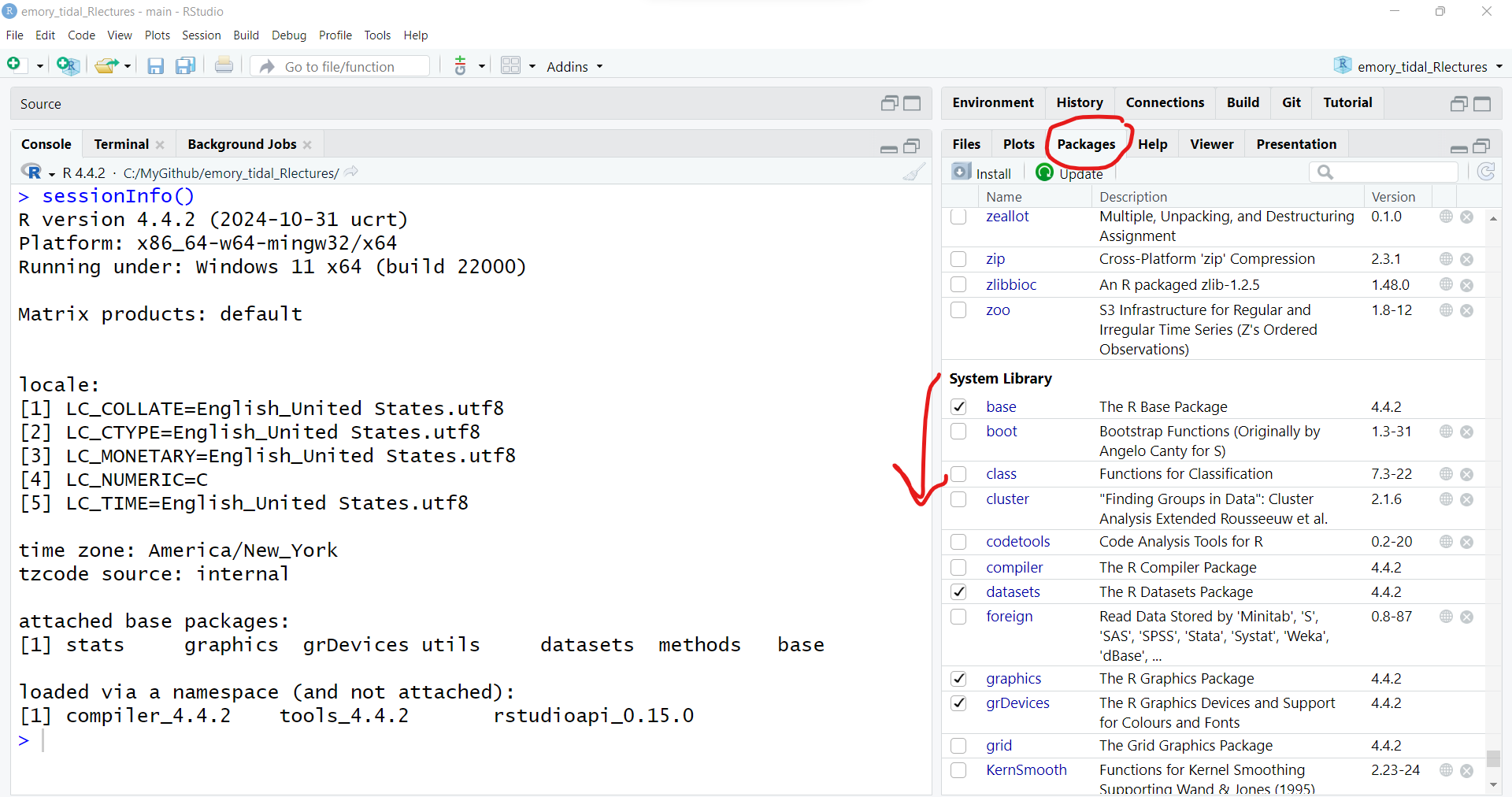 Notice that under other attached packages we can now see ggplot2_3.5.1 indicating that yes ggplot2 is installed and in memory and that version 3.5.1 is the version I am currently using.