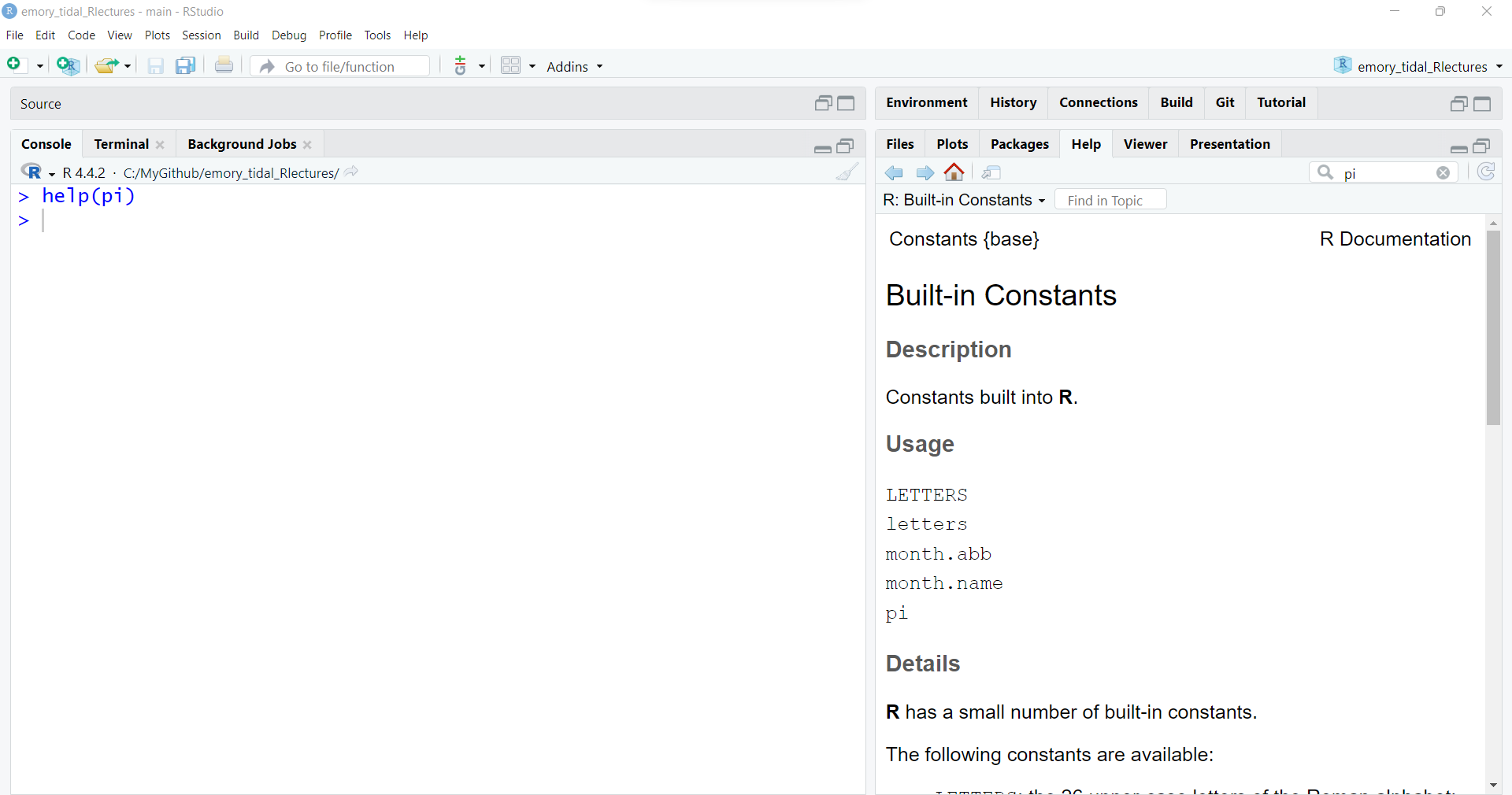 If you would like to learn more about these built-in “constants”, you can get help in one of two ways. You can either type help(pi) in the “Console” (lower left) or type pi in the “Help” window (lower right).