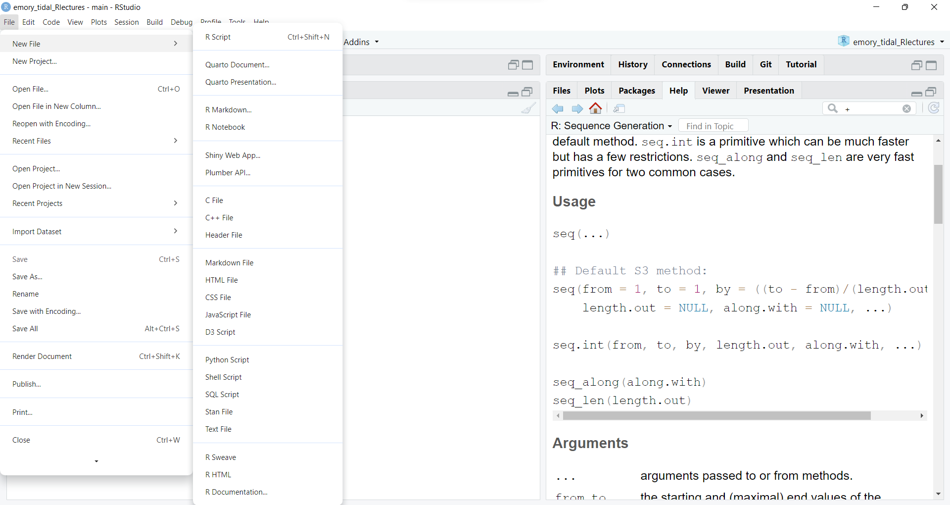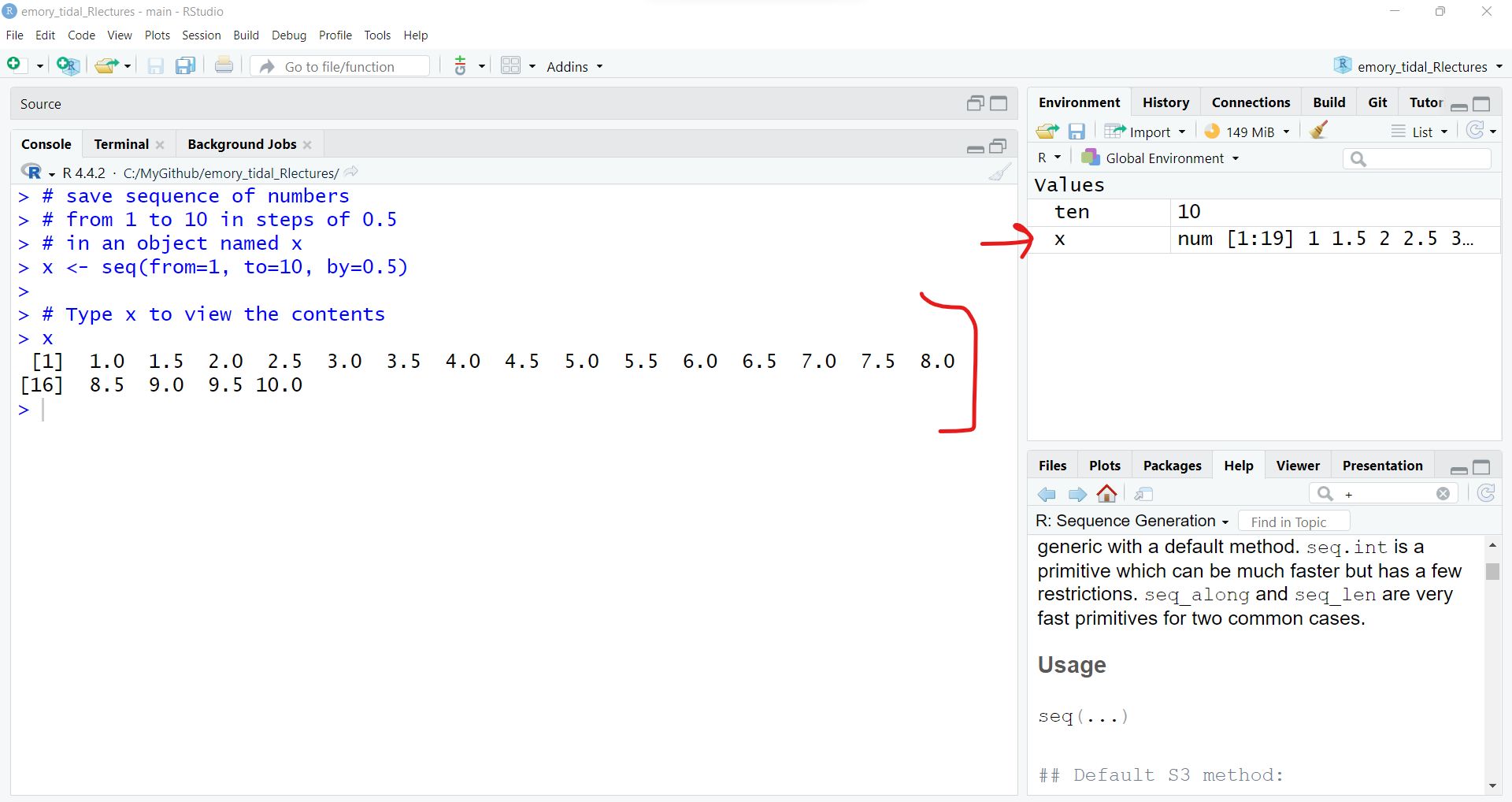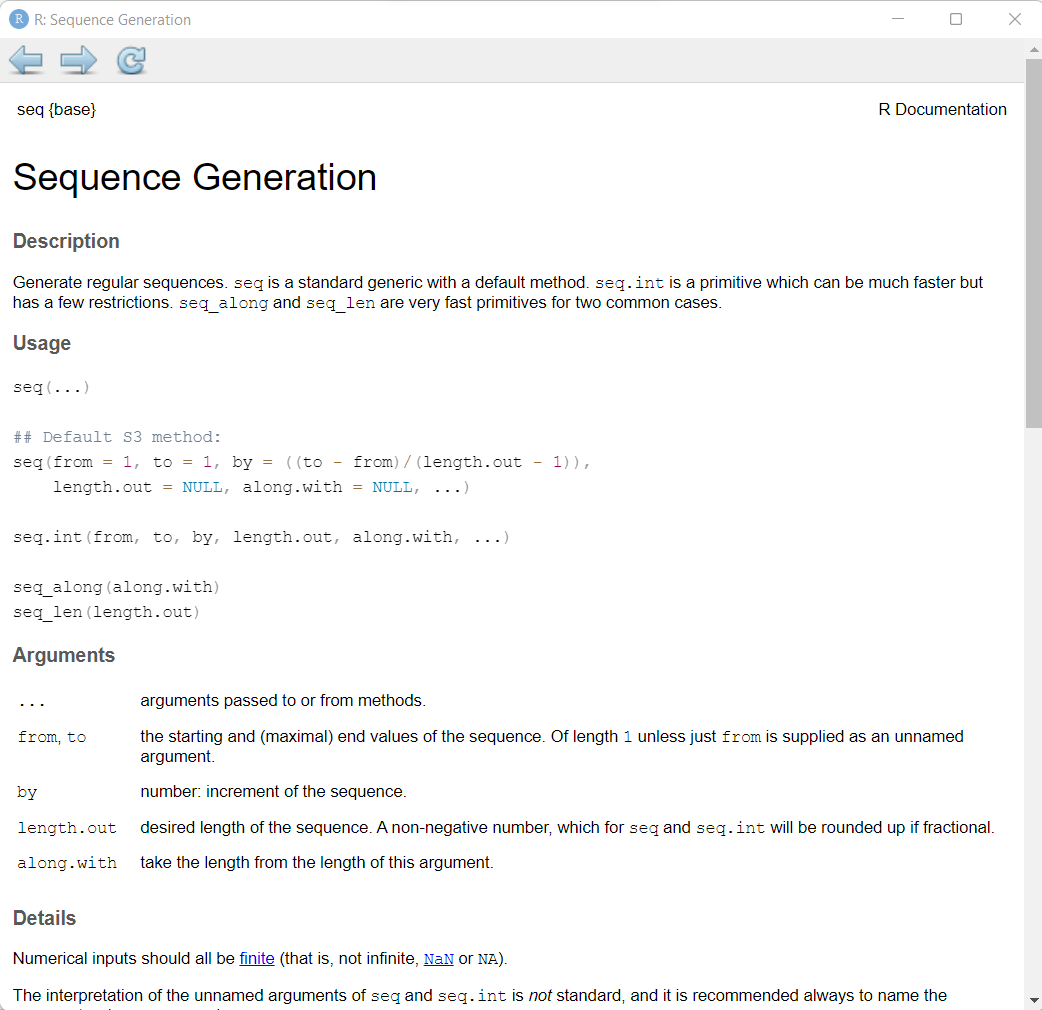 Notice in the “Help” page for seq() shown above that the first 3 arguments are: from, to and by. Each of these can be defined inside the () by using the syntax of the name of the argument, an equals sign =, and then the value (or object) you want to assign: