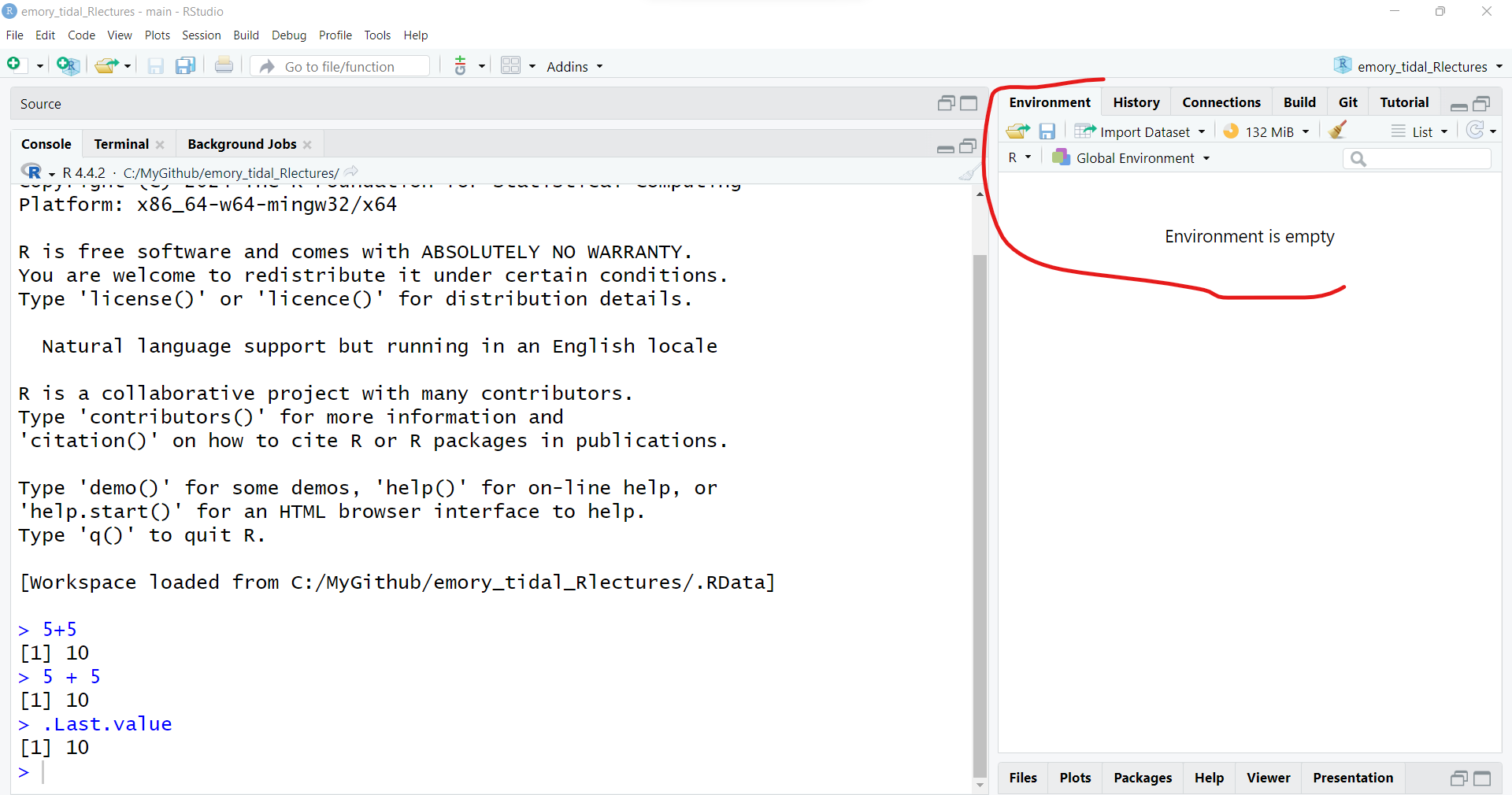 However, if we look at our current computing environment (see “Global Environment” upper right window pane), it is still showing as empty.