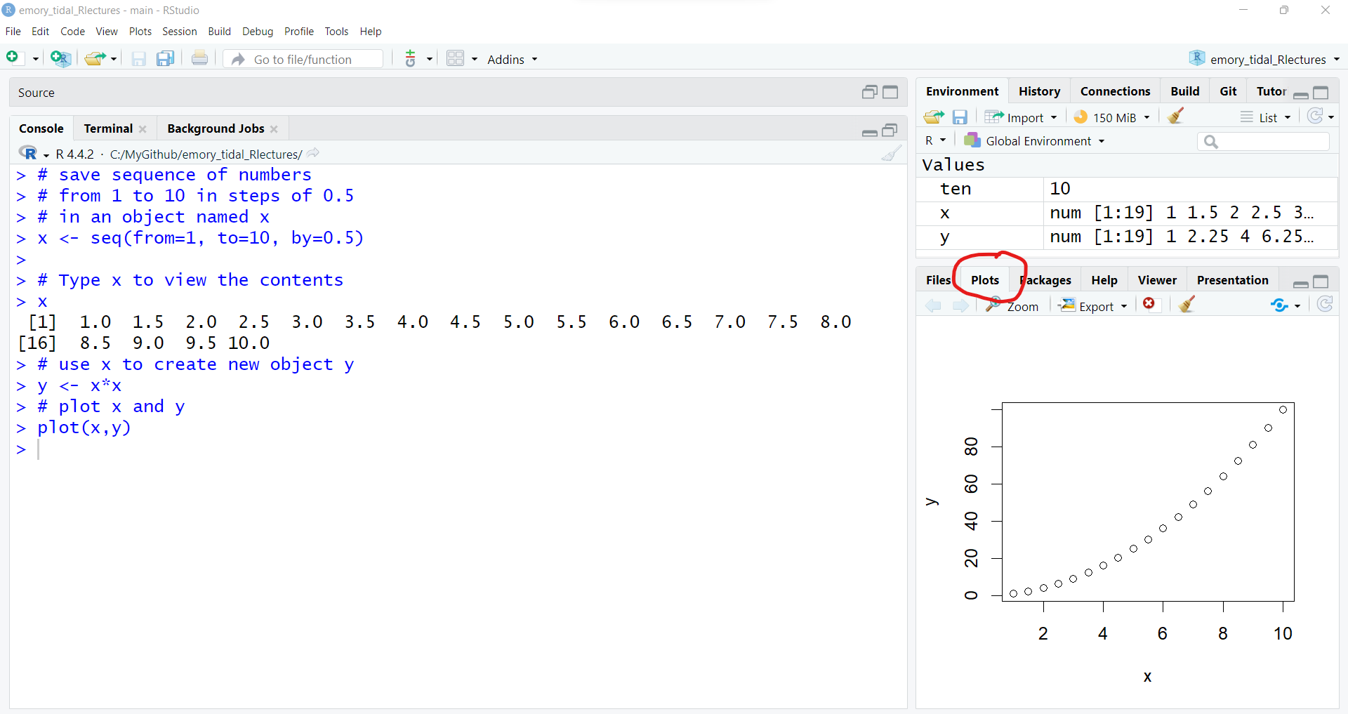 Create a sequence of numbers and save them as an object called x. I also added a comment in the R code block below. Everything after the # hashtag is a comment which R will ignore. It is a good idea to add comments in your code to make sure that you and others understand what each part of your code does (including yourself in a few weeks when you’ve forgotten why you wrote that code step).