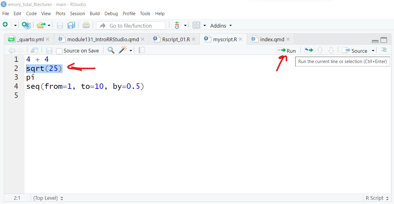 Once the R Script file is created, type in some of the commands we did above in the Console and put one command on each line.