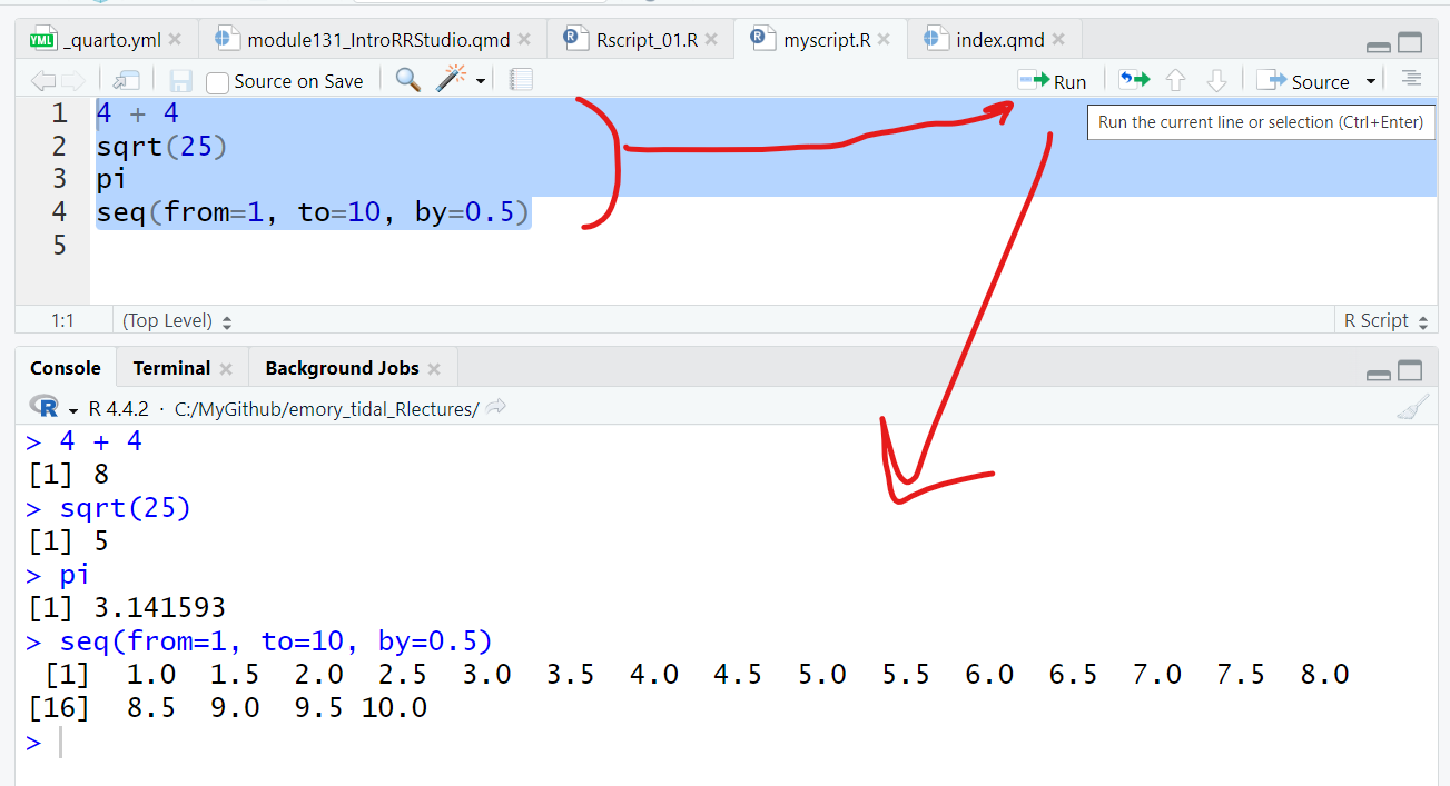 You can type commands in the console window at the prompt “>” but this is slow and tedious. You can also write and execute scripts from inside this application and see the output back in the console window as well as creating plots. But managing large projects using this interface is not efficient.