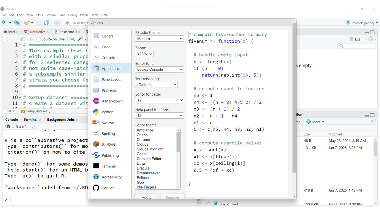 When making changes to your RStudio interface appearance, be aware that ZOOM and FONT size settings work together, so you may need to play around with the settings that work best for your monitor or device you are using.
