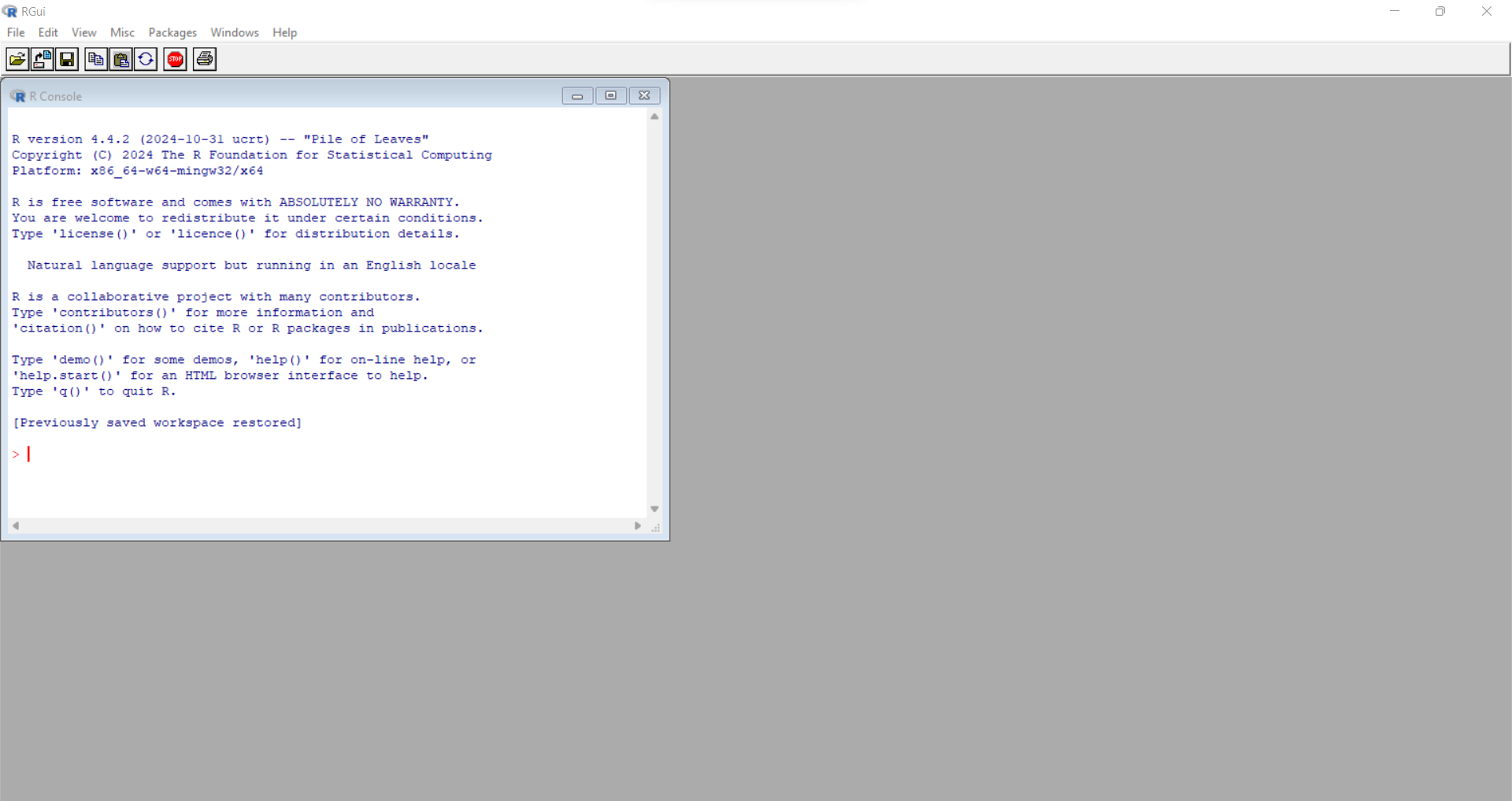 When you download R from CRAN and install it on your computer, there is an R application that you can run. However, it is very bare bones. Here is a screenshot of what it looks like on my computer (Windows 11 operating system).
